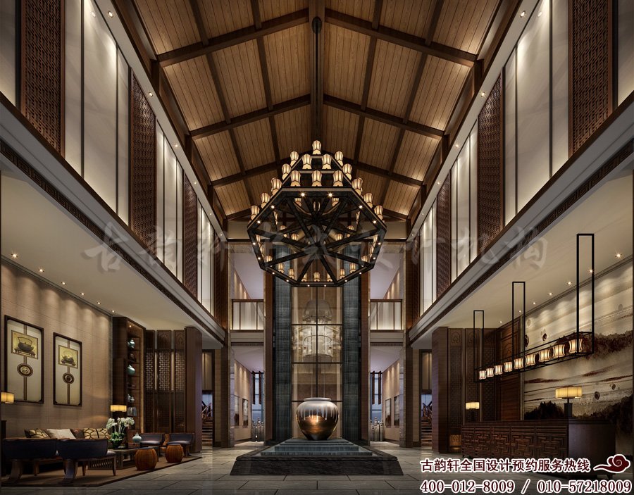 会所大厅宽阔大气、木质的吊顶之下,悬挂着宛如佛塔的灯饰,及其端庄、充满美意
