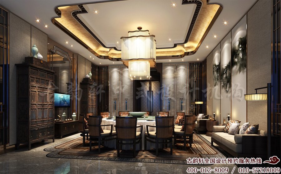 餐厅布置淡雅富丽,艺术化的中式吊灯凸显了会所时尚、舒适的氛围营造