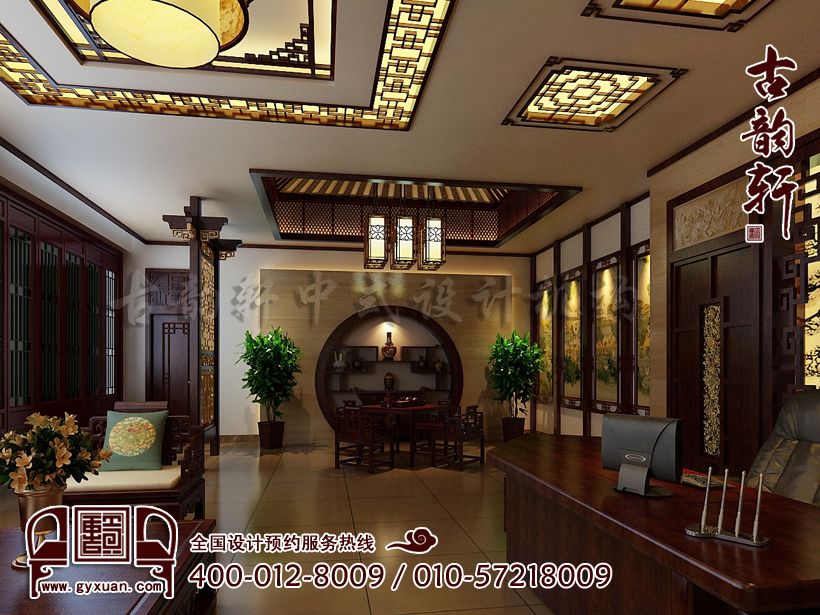 也可根据办公空间中式设计风格的需要,为了打破平衡作法时 ,也往往采用与此相反的手法来取得特殊的效果。